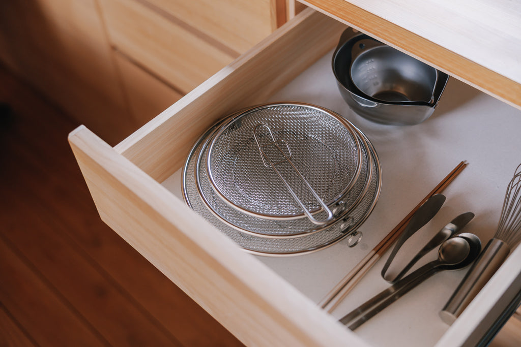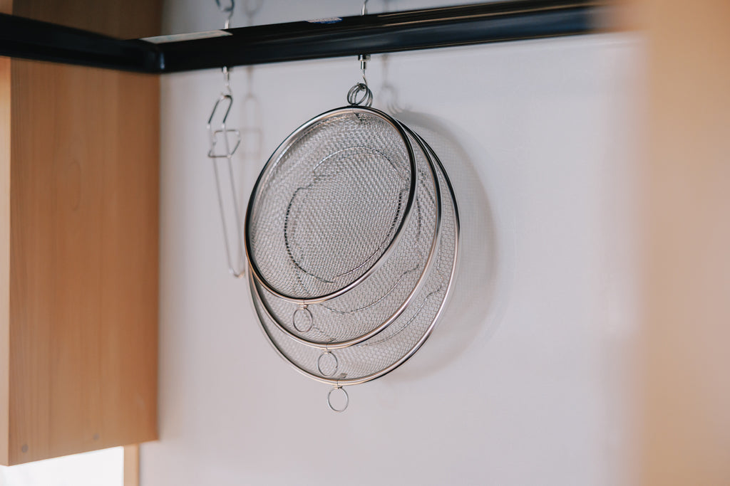 取っ手がない盆ざるは、鍋やフライパンに入れやすく、すっきり収まります。