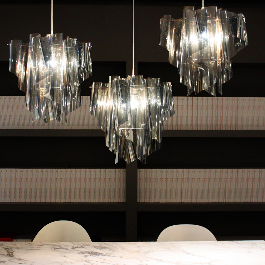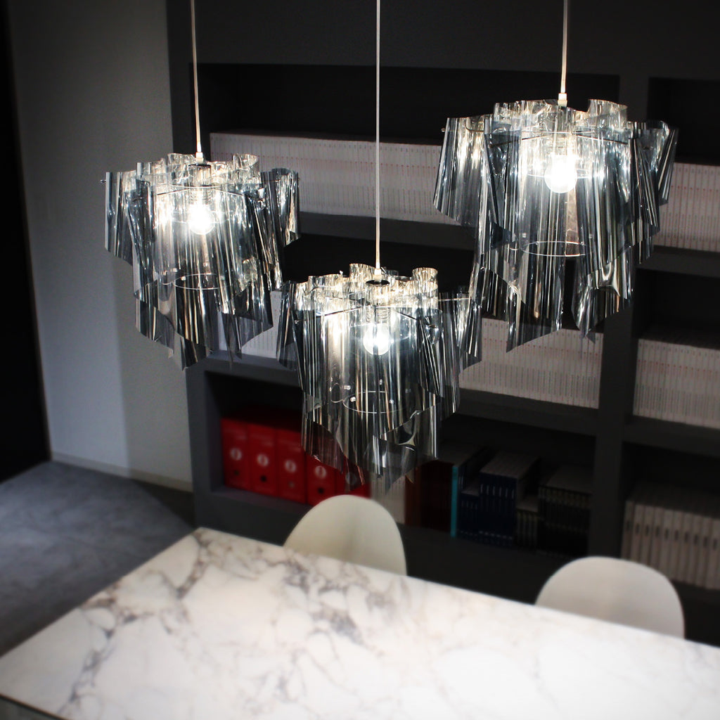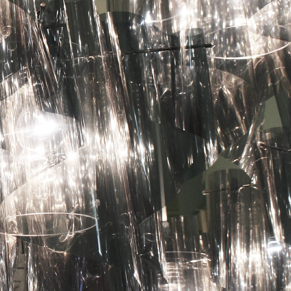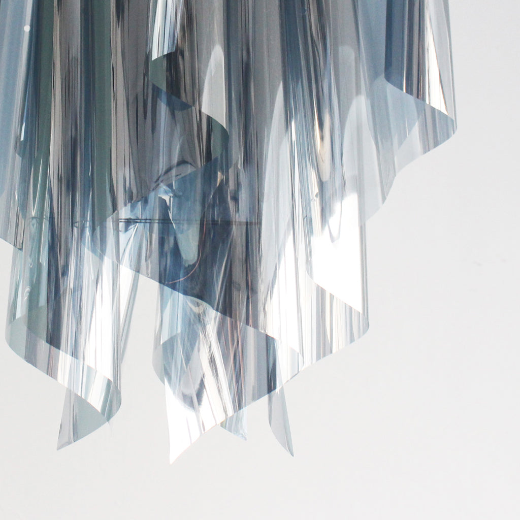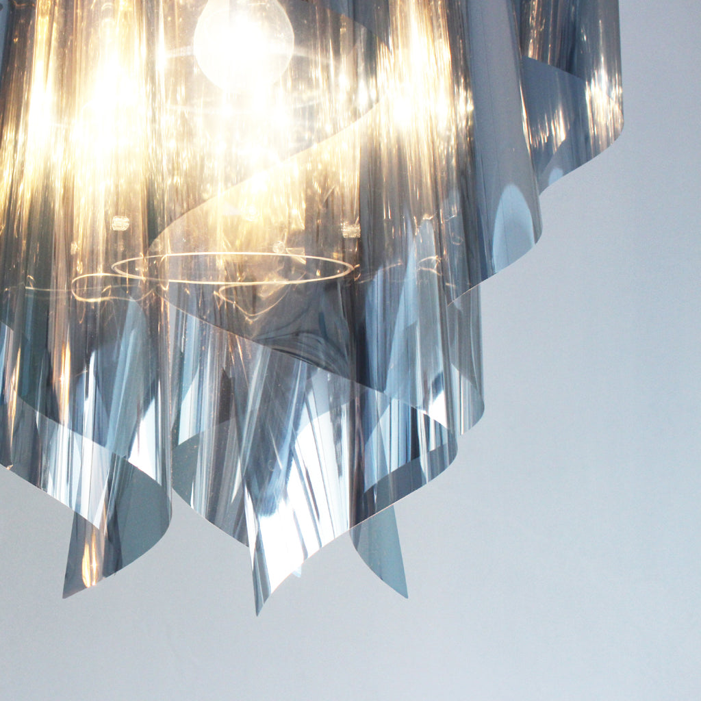 ハーフミラーシェードのドレープに光が乱反射して、幻想的な輝きを放ちます。1灯でもオブジェの様な華やかさがありますが、多灯づかいすることで、アート作品のような迫力のオーロラが現れます。