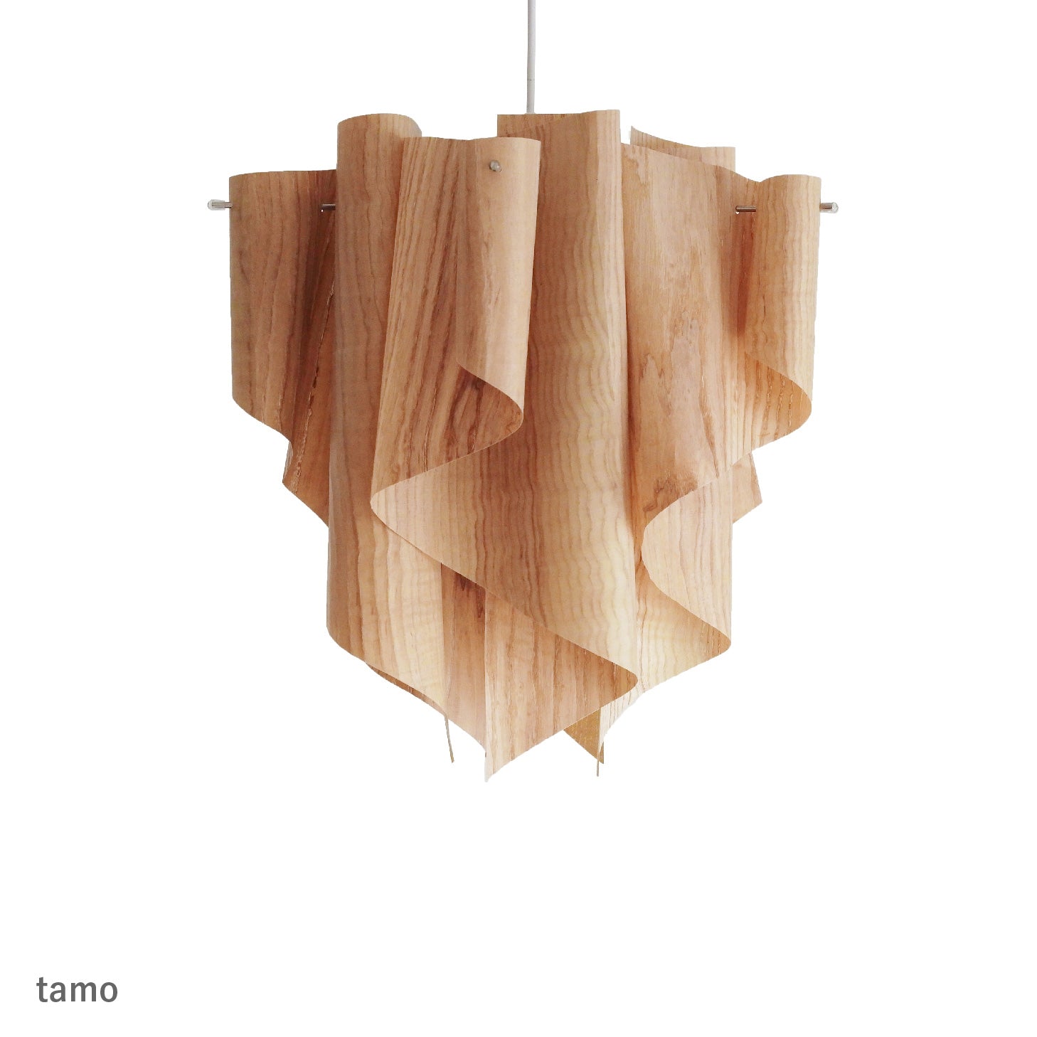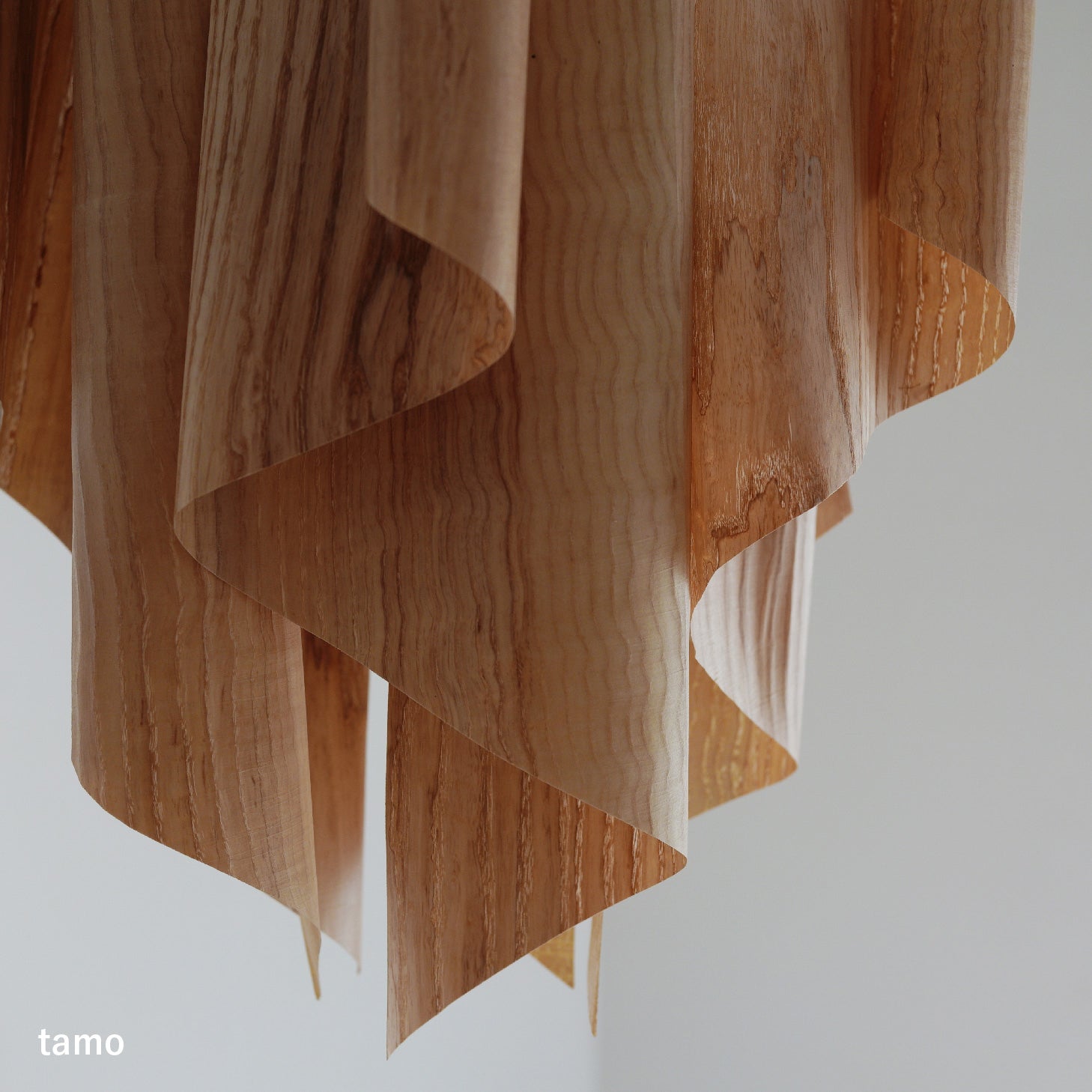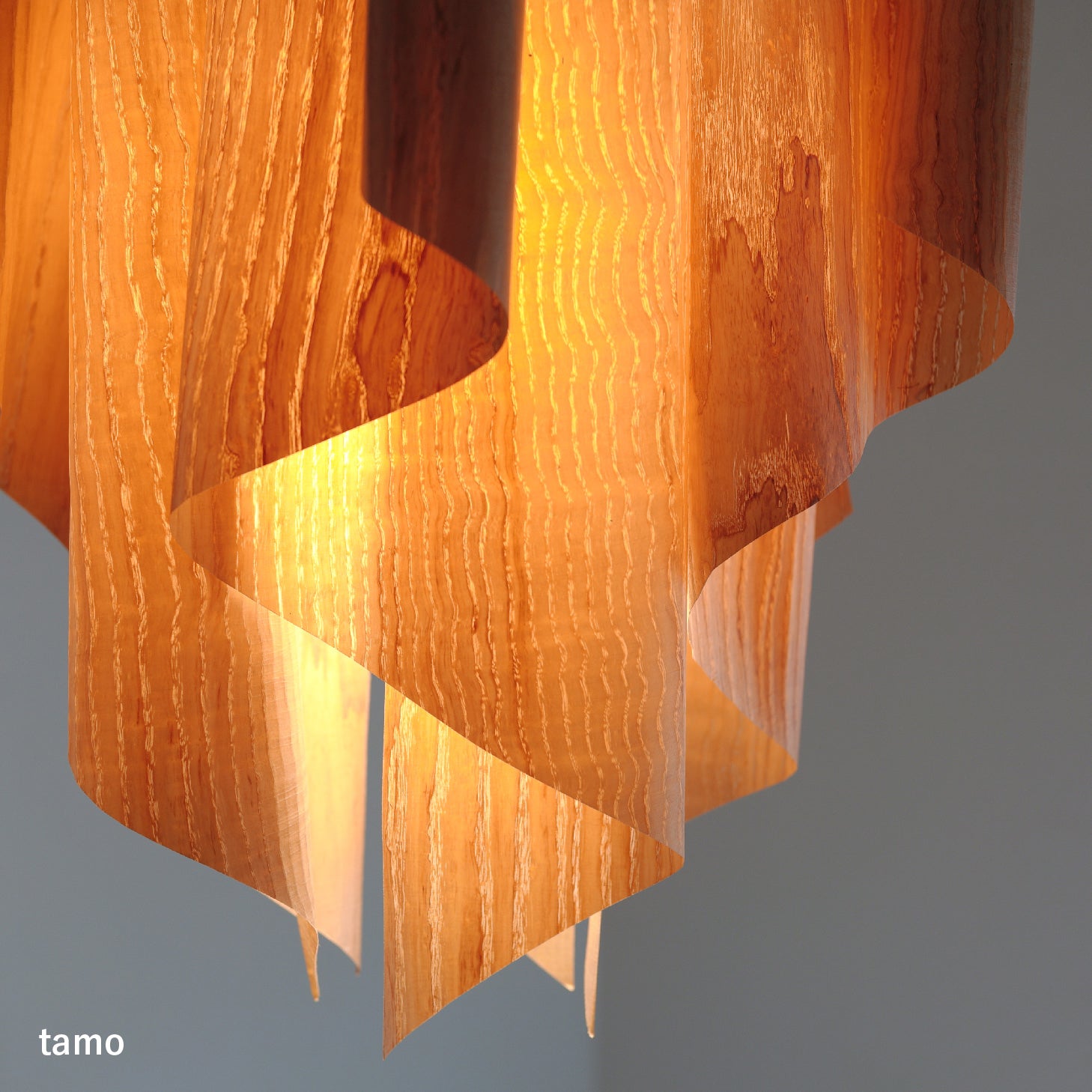 シェードには国産のサクラ材とタモ材を使用。美しい木目を透した光は、やわらかくオレンジがかった温かみのある光となり、空間にやすらぎを与えます。天然木を極薄にスライスし、特殊な下地加工を施すことで、軽やかなカーブを実現しました。