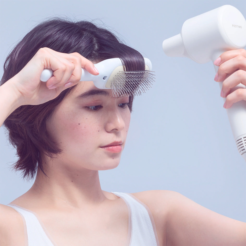 髪は熱が冷めていく過程で形が定着していくので、クセづけしたい形で温風を当て、そのあと冷風を当ててキープ。これを繰り返すことで、効率的に髪をスタイリングできます。
