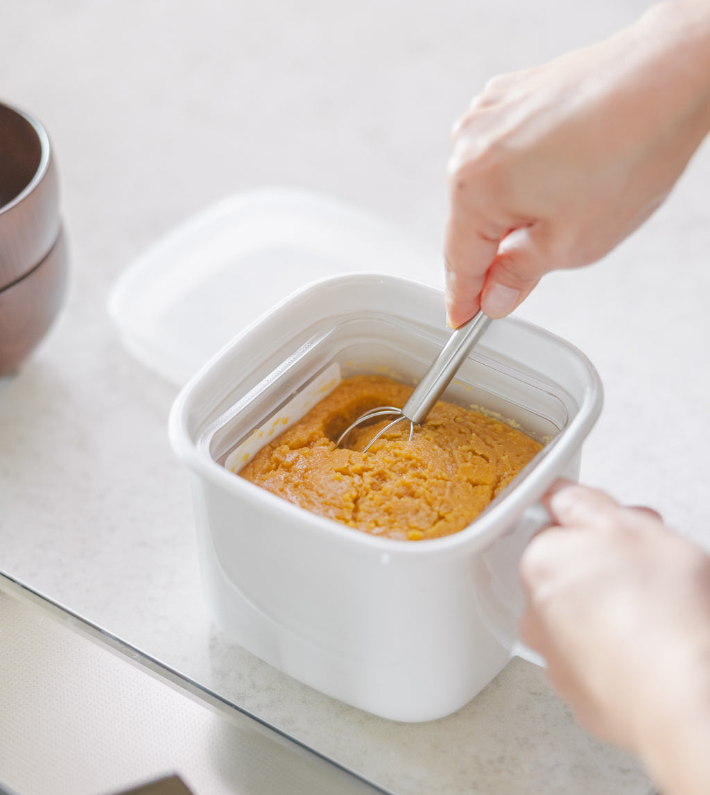 取っ手付きなので、冷蔵庫からの出し入れがしやすく、しっかりと密閉してくれるので、お味噌の乾燥・酸化を防ぎ、お味噌が長持ちします。