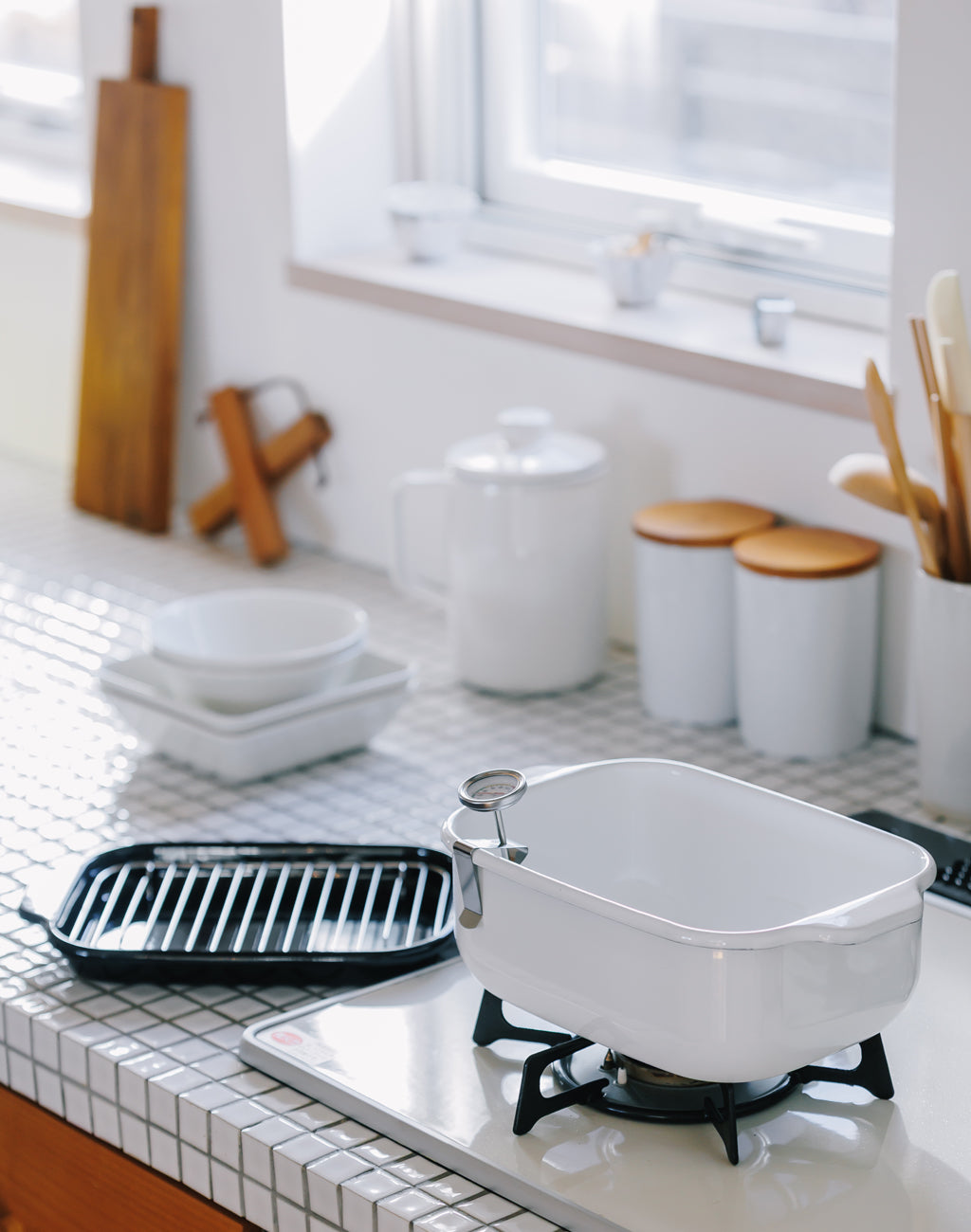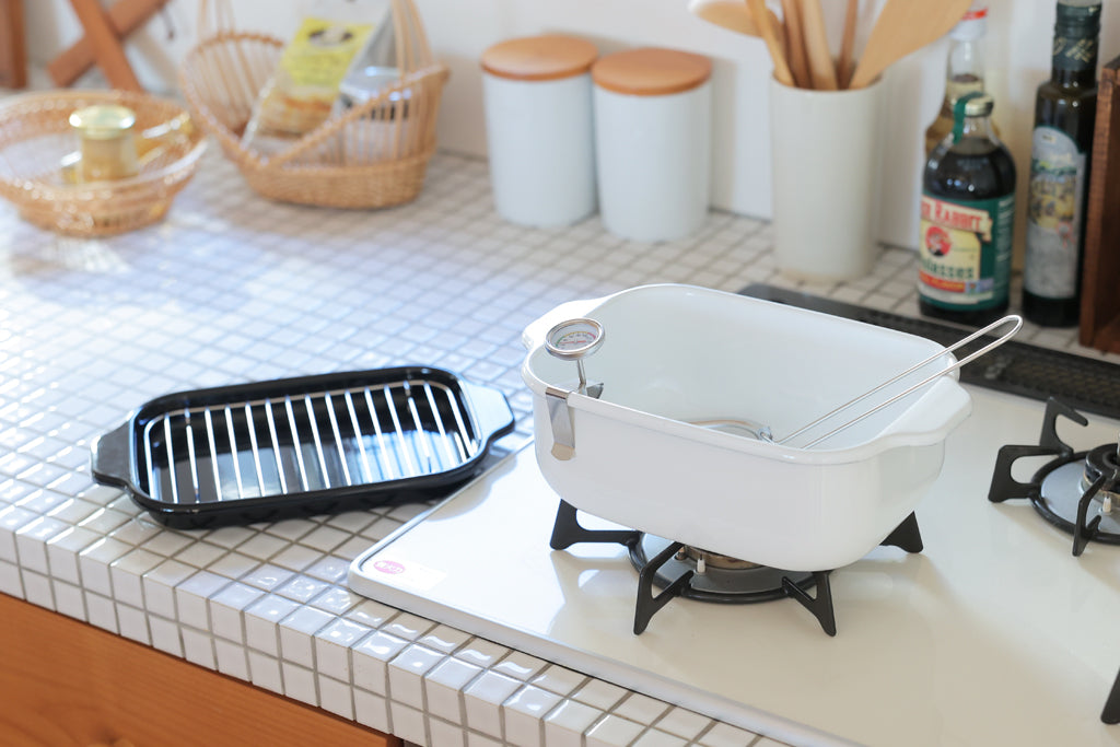 富士ホーローの、角形天ぷら鍋は、コンパクトサイズで使いやすさにこだわった設計。