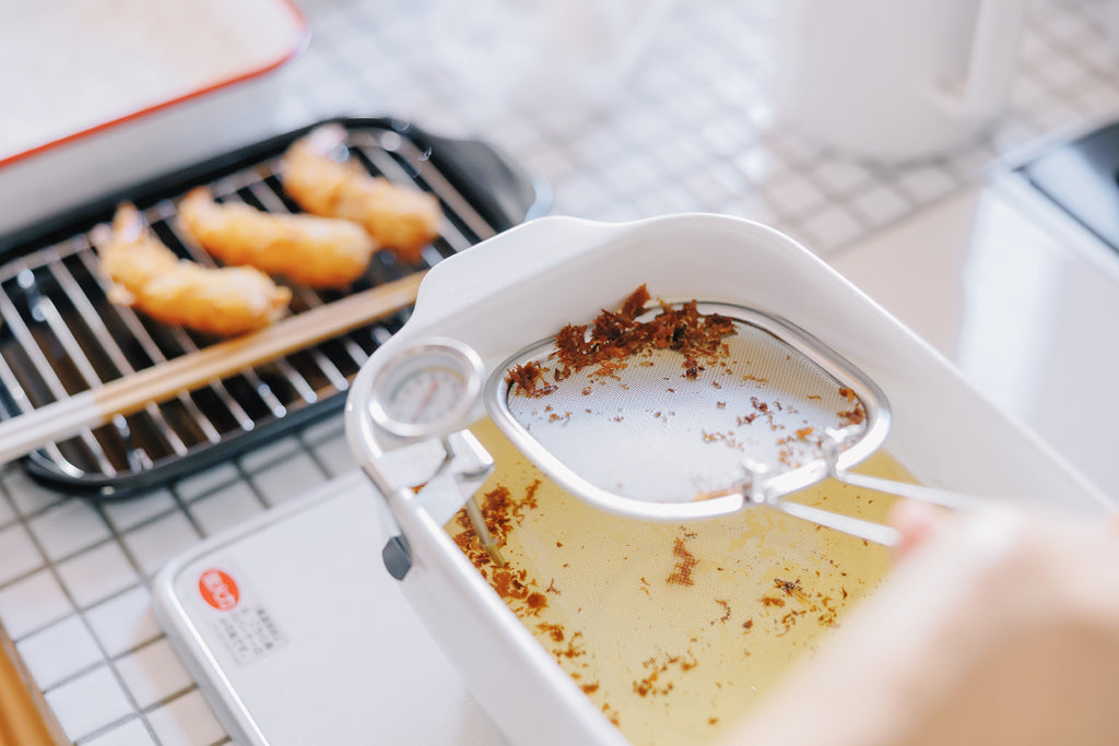 揚げかすを取り除くことで油をきれいに保てるので、続けて揚げ物をすることができます。