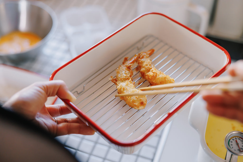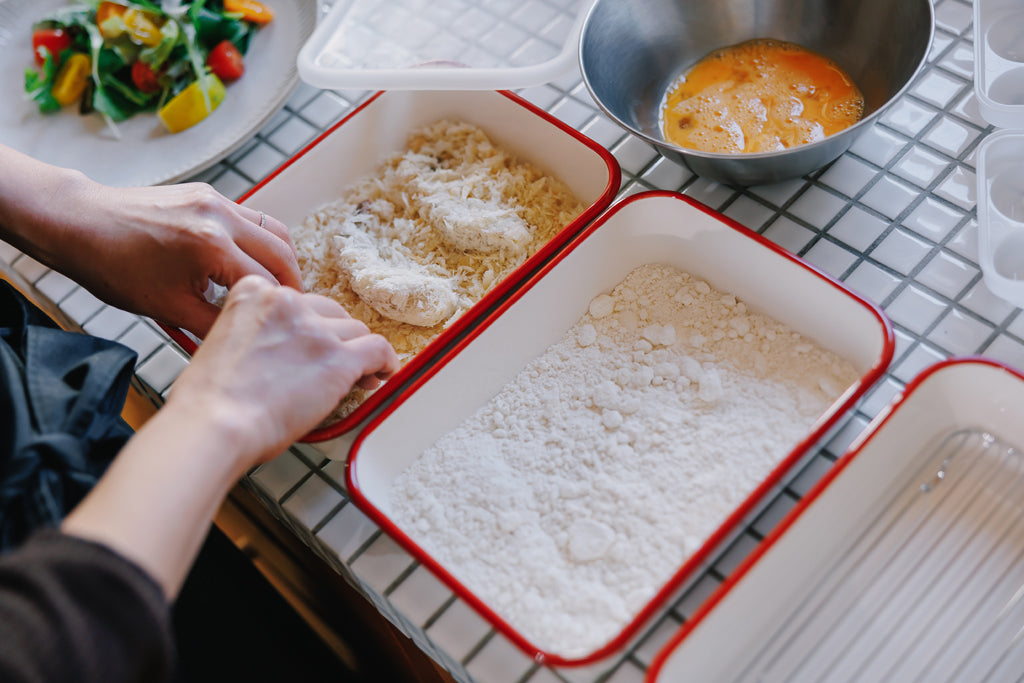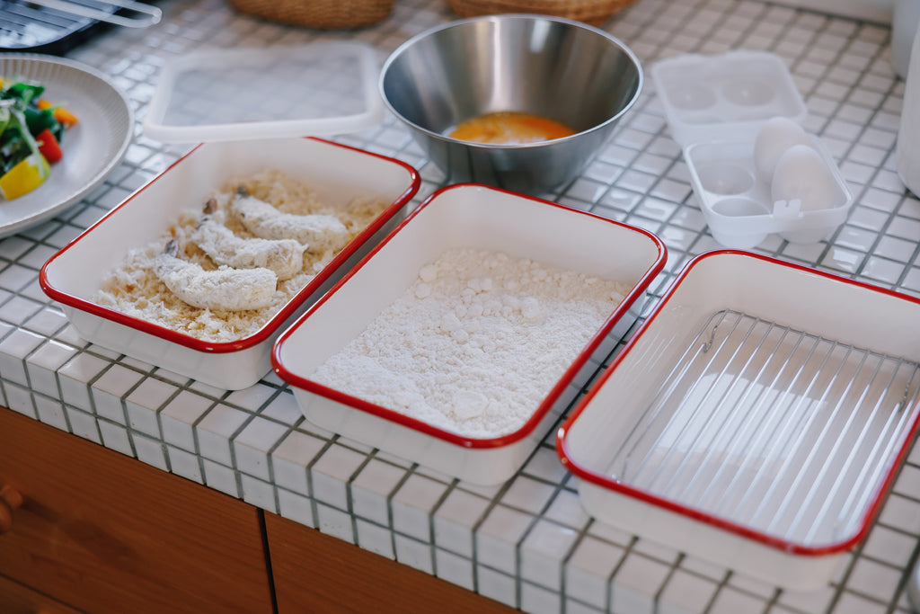 揚げ物の際の下ごしらえや保存に便利な、レトロかわいい赤フチが目を引く、ホーローバットセットです。