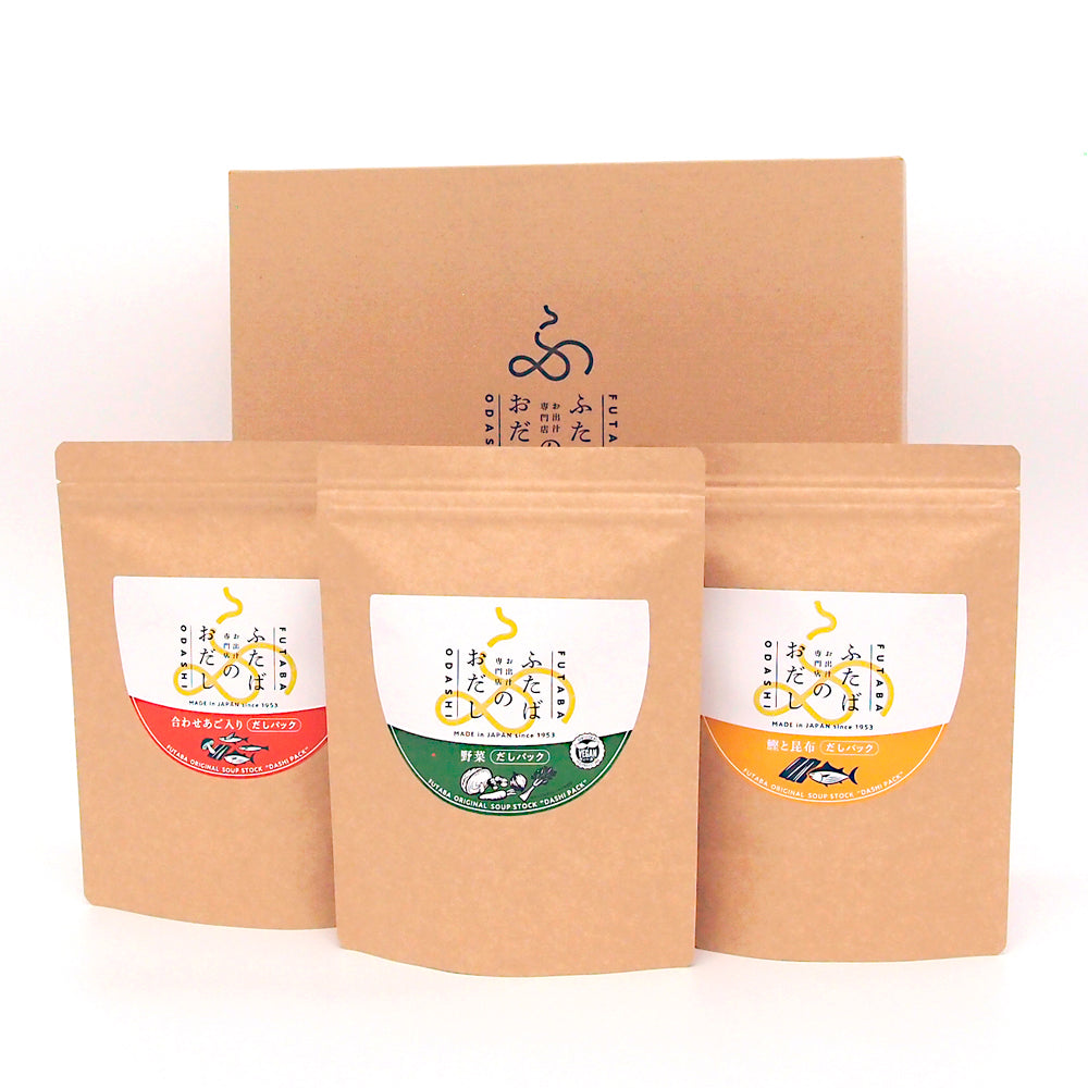 ふたばのおだし鰹と昆布(18P)、ふたばのおだし合わせあご入り(18P)、ふたばのおだし野菜(15P)から3品選べるギフトセットです。