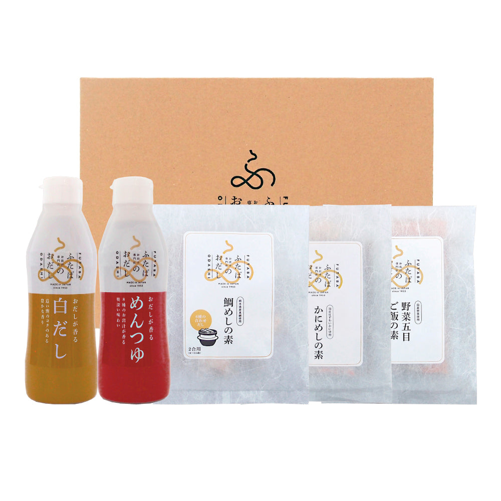 ふたばのおだし 詰合せ4543 【 炊き込みごはんの素(鯛めし/かにめし/野菜五目)・めんつゆ・白だし 】
