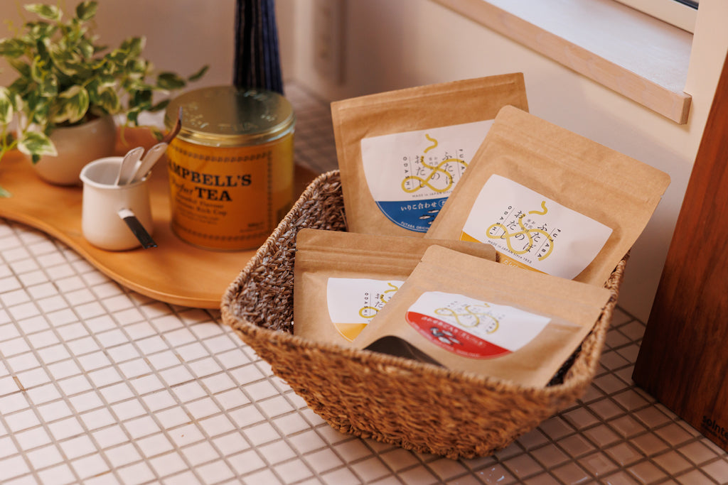 焙焼した国産いわし煮干しに4種の国産素材を配合し、深みのあるコクと香りが凝縮しただしです。