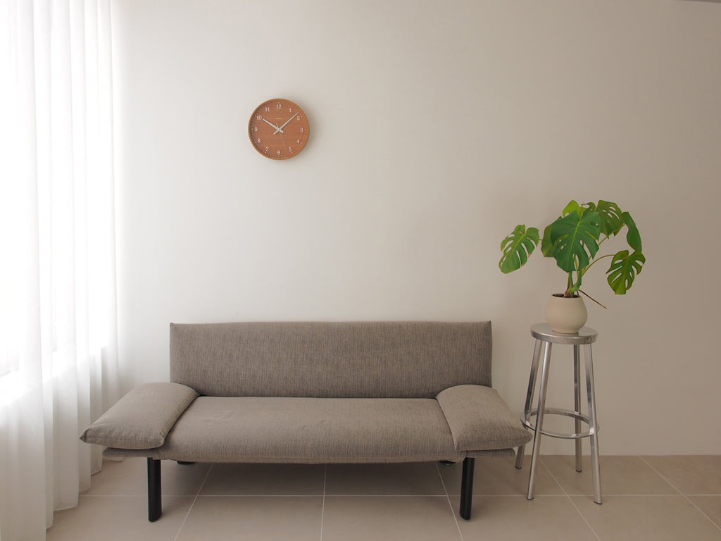 上質な天然木突き板を文字盤に採用し、ガラスに印刷を施したシルバー指標は、ゆらめく軽やかさがアクセントになっています。