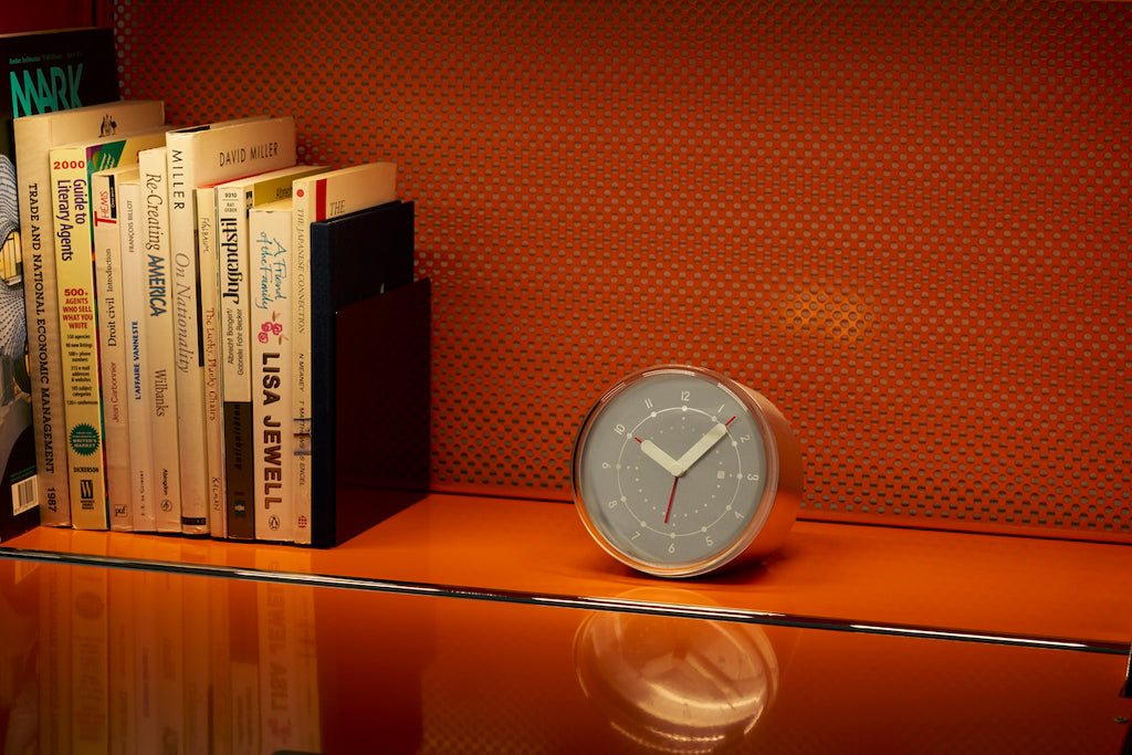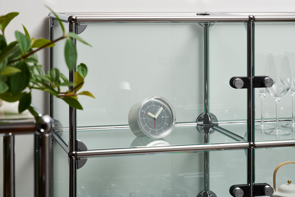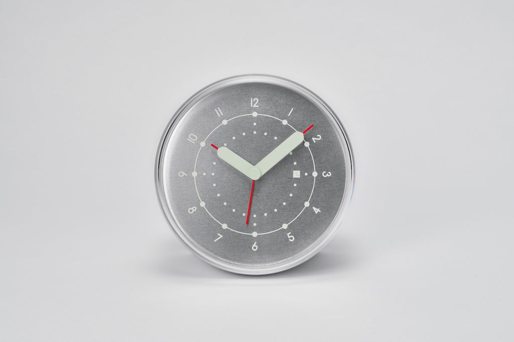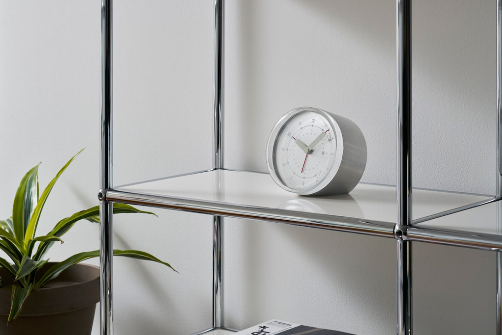 アルミニウムの円筒をカットしたシンプルなフォルムの目覚まし時計です。
