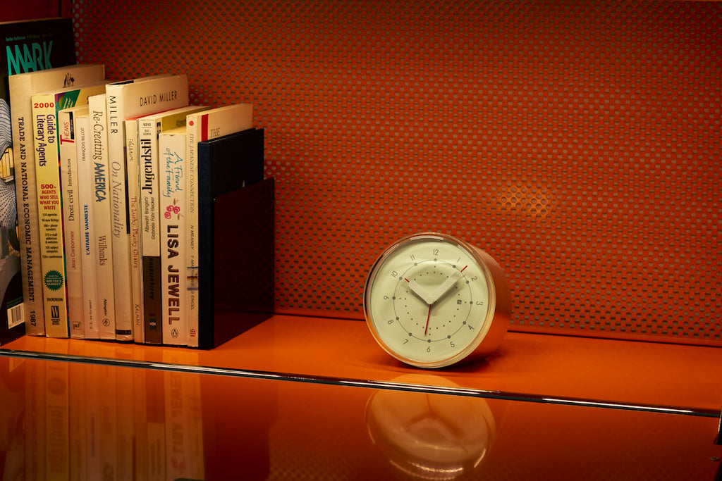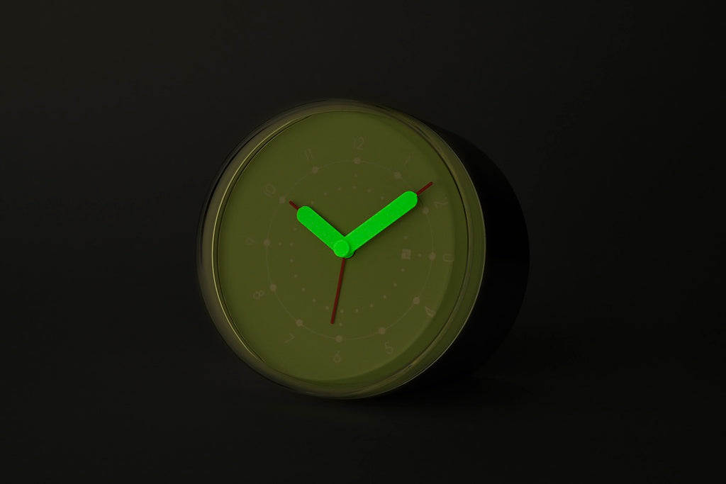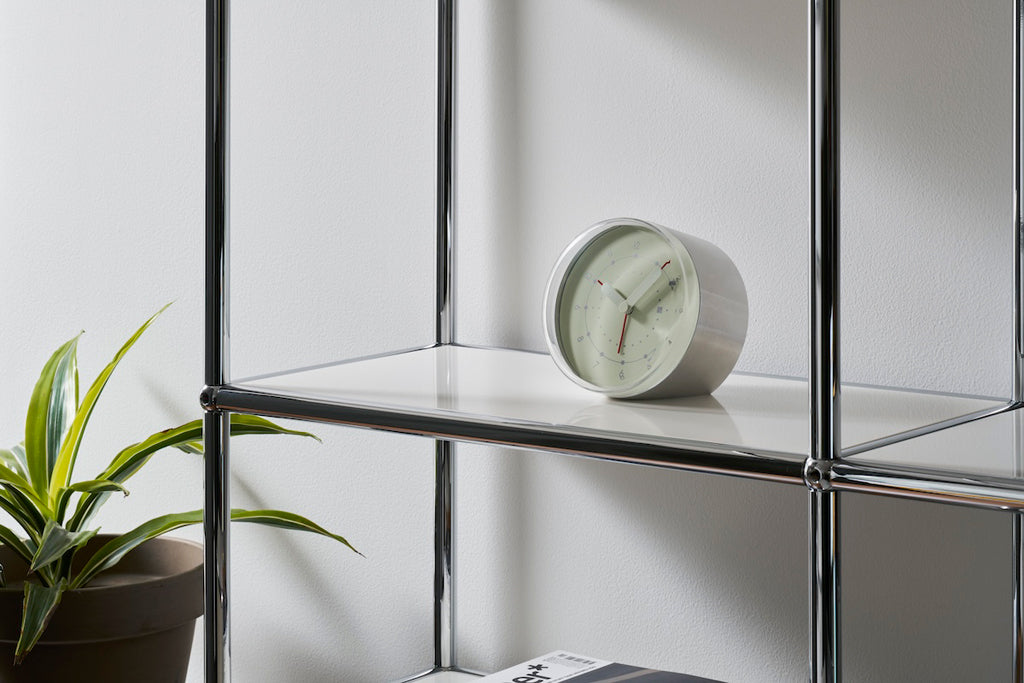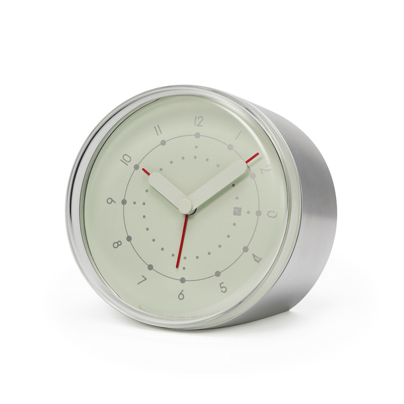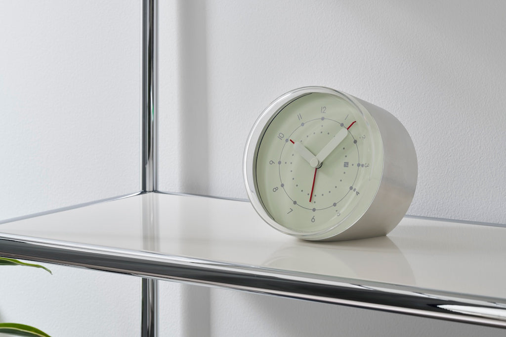アルミニウムの円筒をカットしたシンプルなフォルムの目覚まし時計です。
