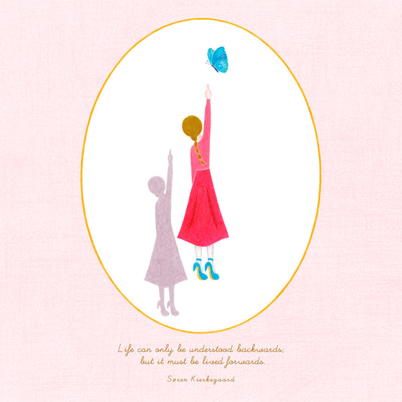 中央下の英文は “Life can only be understood backwards; but it must be lived forwards.”(訳:人生は後ろ向きにしか理解できないが、前を向いてしか生きられない。)