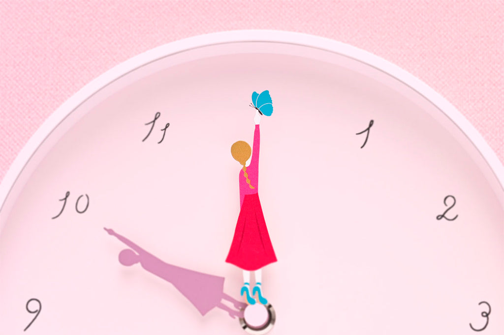 本体の12時をしめすところに「夢」を象徴するモチーフ(風船/蝶/流れ星)をあしらい、分針の女の子がモチーフのところまで進むと、それらを捕まえているように見える仕掛けとなっています。