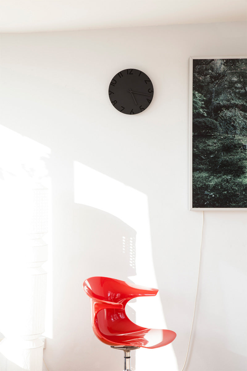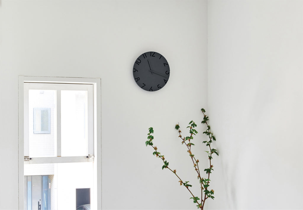 文字盤に色をつけることによって、彫り込んだ文字が色のグラデーションのようにも見え、 ミニマムなフォルムながらも空間に色のアクセントを与えます。