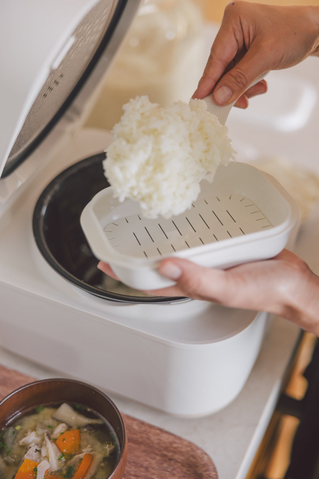 すのこパーツのおかげで、余分な水分が下に落ちるので、ご飯のべたつきを防ぎます。