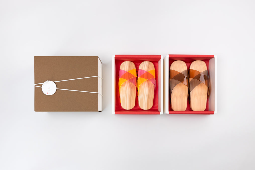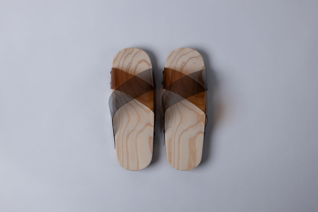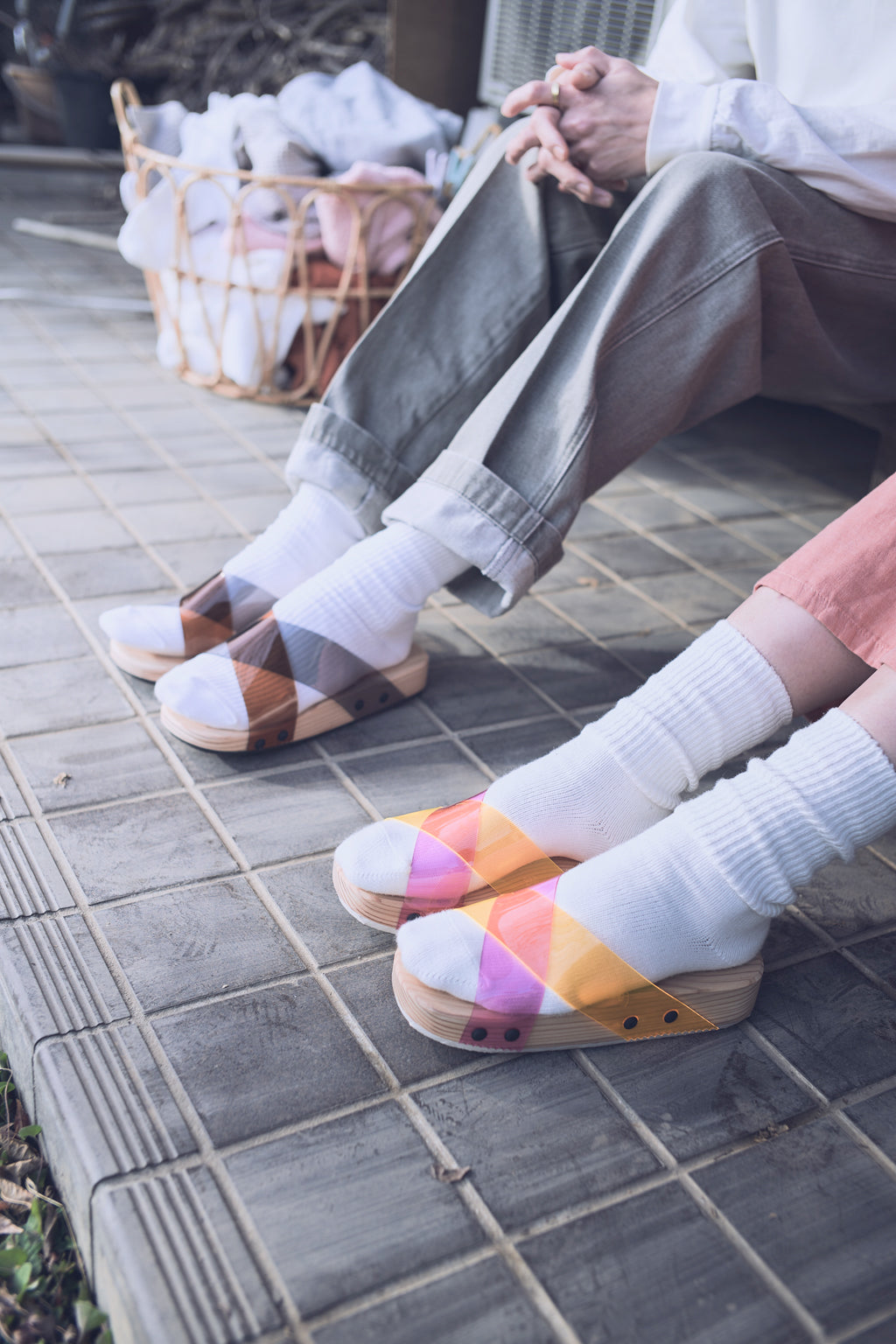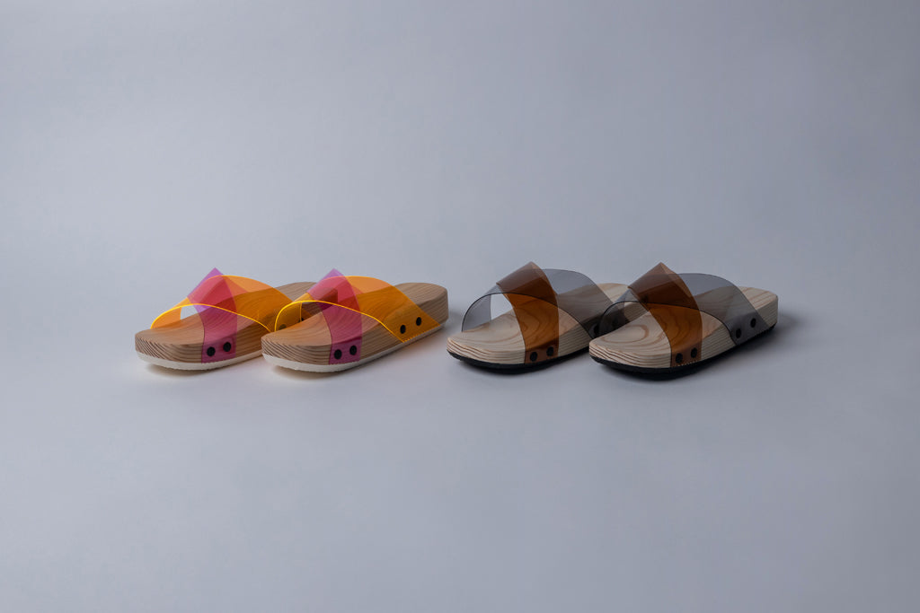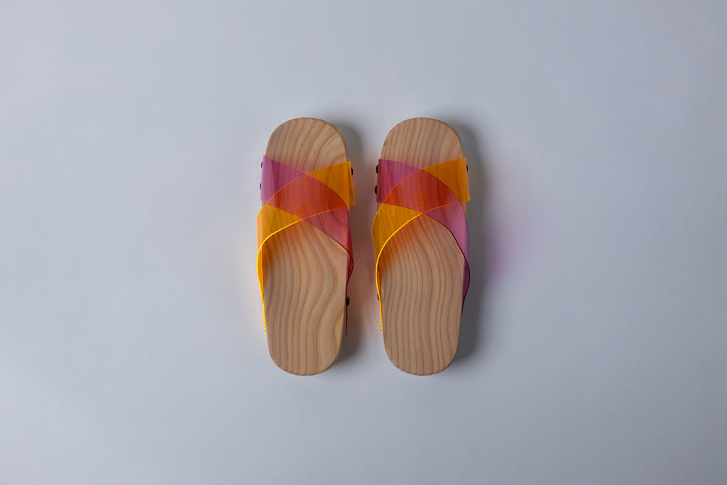 さらりと気持ちの良い国産の杉材と、カラフルなPVC バンドのコントラストが新しいつっかけサンダル。