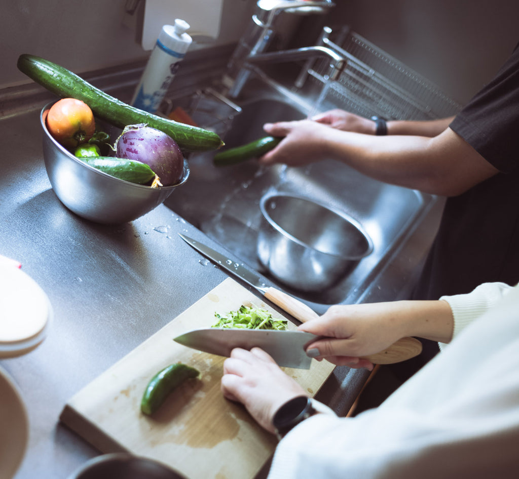 妻が大根を切り、夫は隣で、じゃがいもの皮を剥く。