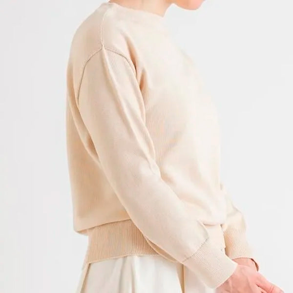編み機から、一着そのままのかたちで立体的につくられる縫い目のない「ホールガーメント製法」で編み立てました。