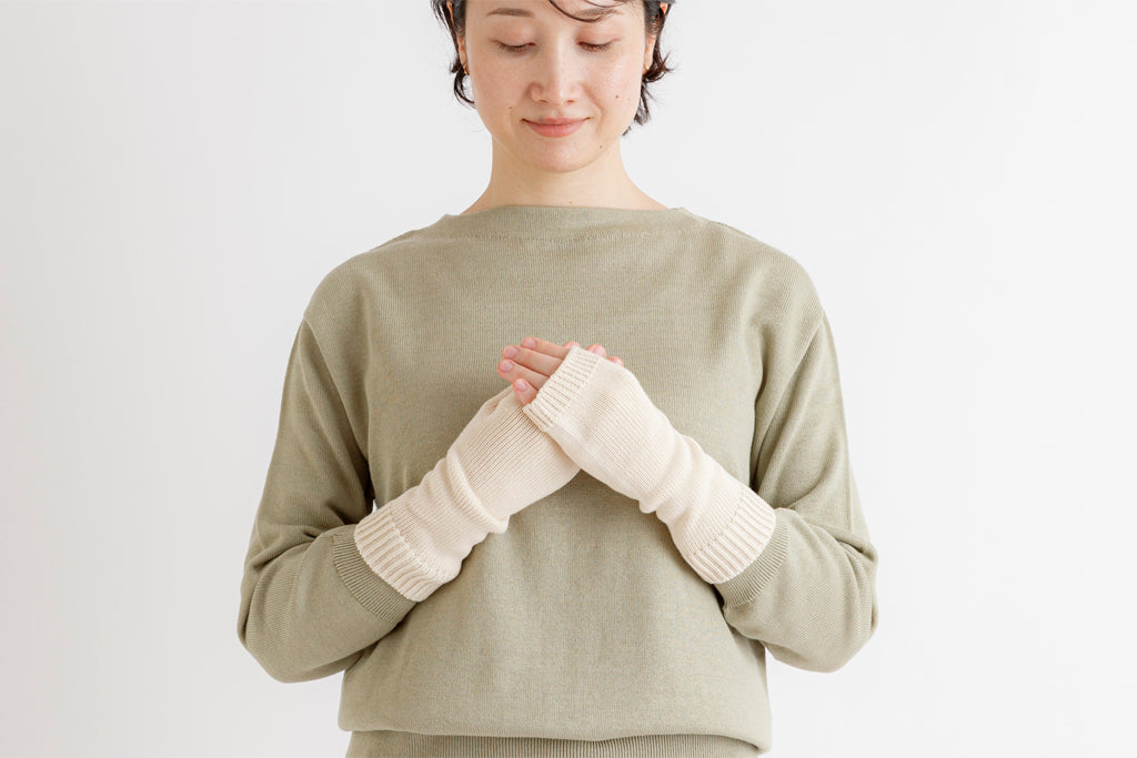 親指先も開いているので、手先を使う繊細な動きを優雅に叶えます。手首を包み込むリブは締め付け感を与えず、自然な温もりをやさしく纏ってくれます。