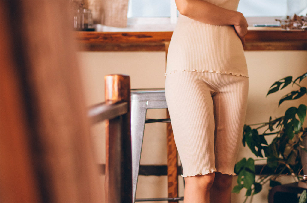 リブ5分丈パンツは足回りにゴムが入っていないので鼠径部を締めつけず、血行を阻害しにくいつくりです。