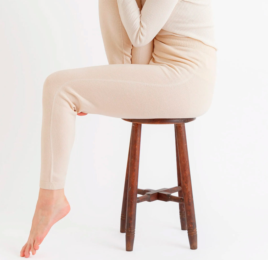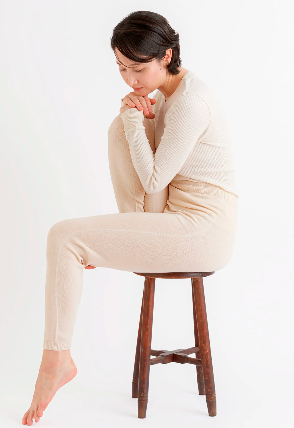 縫い目がないので素肌に直接履いてもゴワつきがなく、リラックスタイムにも気持ちの良いニットパンツです。着用すると見た目よりもしっかりと伸びてくれます。